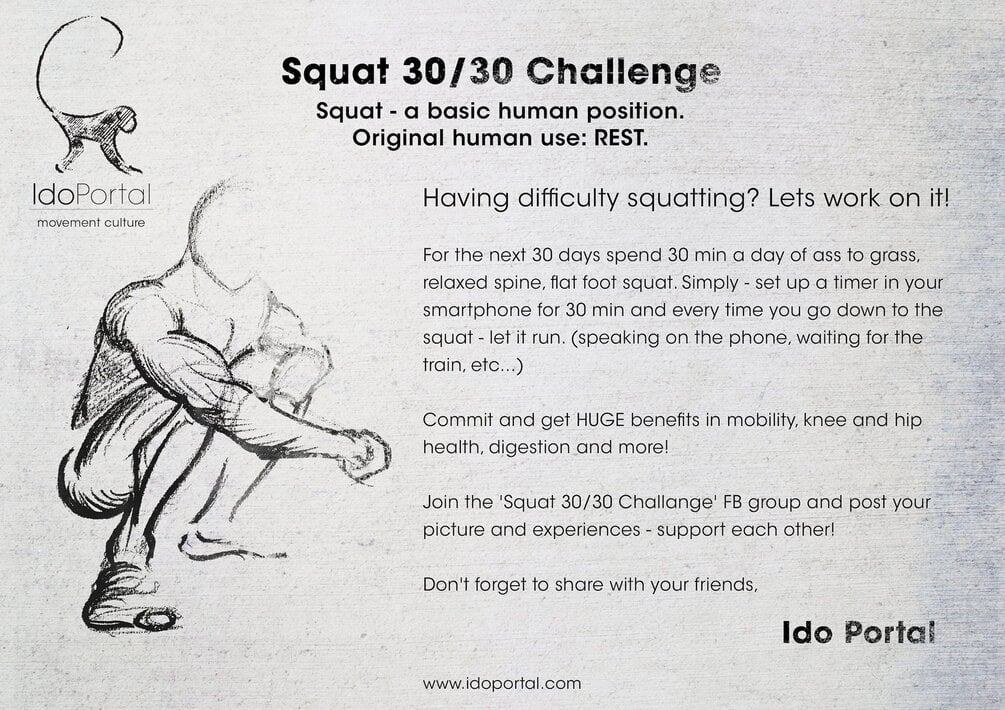 The goal is to achieve 30 minutes in a squat every day for 30 days.